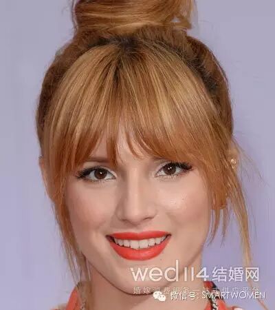 整齐的厚刘海会让脸看上去更圆,专家建议齐刘海最好是和层次长发搭配。如果要剪薄刘海,那么要注意要中间短两边长,从而实现瘦脸效果。